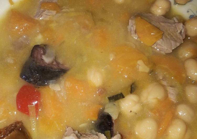 - Colocar a carne na véspera com sal. No dia seguinte cozer a carne com o pimento e a cebola. Quando a carne estiver cozida retirar para cortar em pequenos pedaços, entretanto cortar os legumes todos em pequenos quadrados e colocar no caldo da carne e deixar cozer bem. No final colocar a carne e o grão e deixar cozinhar mais um pouco. Se a sopa ficar muito liquida pode juntar 1 colher de sopa de amido de milho. É deliciosa..