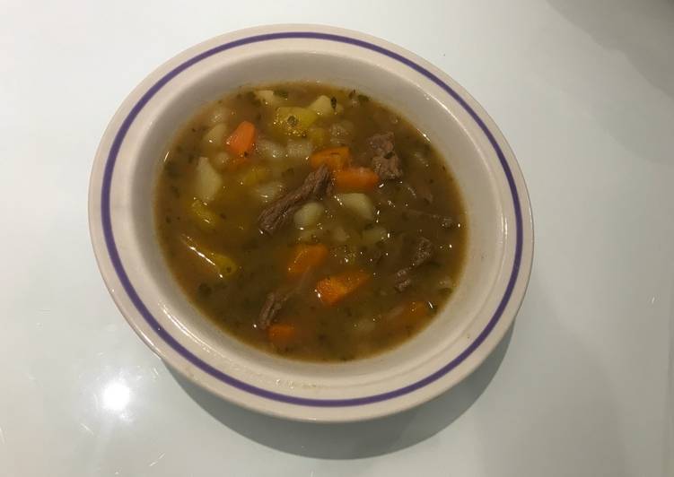 - Dissolva o caldo de carne em meio litro de água quente e acrescente à carne. Assim que a carne e os legumes estiverem cozidos, acrescente o cheiro verde. Se achar necessário, acrescente mais sal..