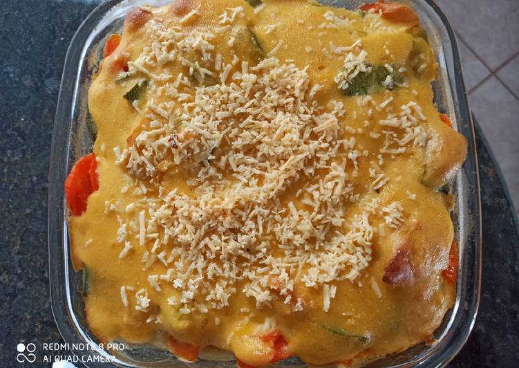 - Numa travessa coloque a carne moída com o molho, uma camada de purê, uma camada de legumes já cozidos e picados/ cortados a seu gosto..