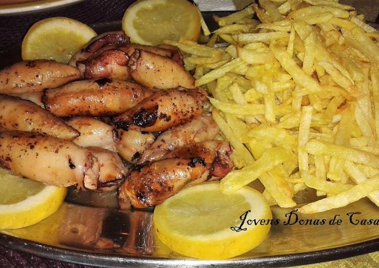 - Numa frigideira coloque o azeite, a cebola e os dentes de alho. Leve ao lume a refogar. A seguir junte o preparado que foi picado e envolva, deixando refogar mais um pouco, depois junta o leite e a farinha peneirada, tempera com sal e pimenta preta a gosto. A seguir vai rechear as lulas com a ajuda de uma colher e por fim prender a abertura com palitos. Depois deve fritá-las em óleo bem quente. Retire deixe escorrer o excesso de óleo. Sirva acompanhado de batatas fritas e/ou arroz..