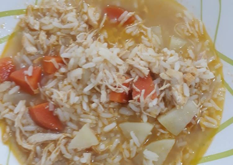 - Após acrescente o peito de frango desfiado, a batata, a cenoura e o arroz e deixe ferver tudo. Após é só servir..