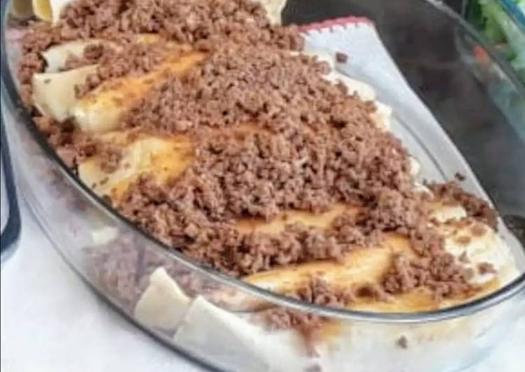 - Preparo: Pegue as panquecas, coloque uma fatia de mussarela e uma porção de carne e enrole. Faça esse processo com todas as panquecas. Jogue um pouco de caldo no fundo de um refratário para untar. Coloque as panquecas já prontas no refratário e despeje sobre elas o resto do molho..