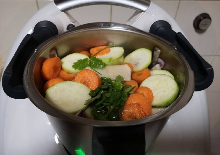 - Descascar todos os ingredientes e reservar as cascas. Lavá-las e fervê-las com cerca 1L de água 15 min/vel inversa..
