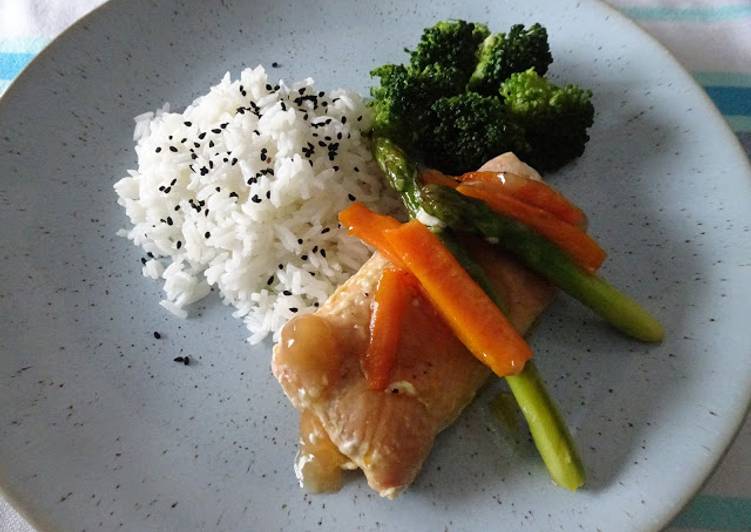 Salmão com molho Teriyaki, arroz branco com sementes de sésamo pretas e legumes.