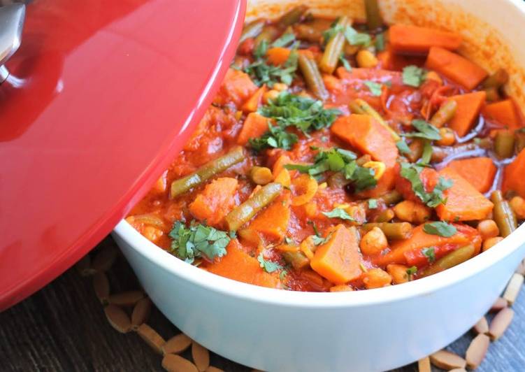 - Retire a casca da abóbora e da batata doce e corte ambas em pedaços ou cubos. Reserve. Descasque e pique a cebola e o dente de alho e leve ao lume num tacho com o azeite, até a cebola alourar. Junte o tomate e deixe refogar mais um pouco e depois a pasta de caril de modo a envolvê-la bem na mistura. Junte a abóbora, a batata doce e o feijão verde e cubra de água até cobrir a meio..