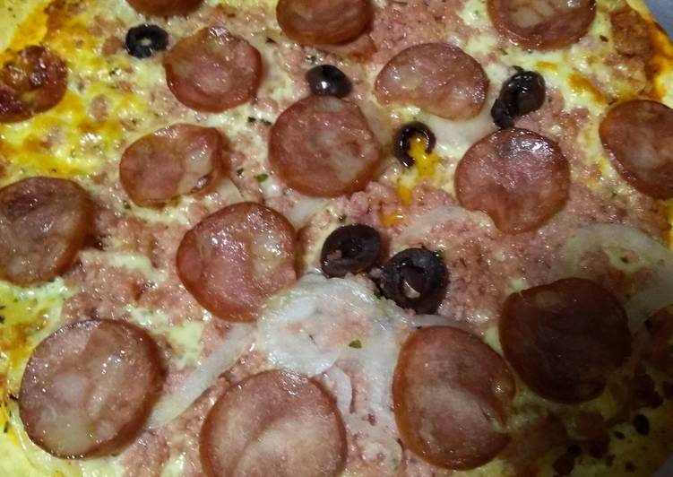 You can have Pizza de Linguiça Toscana e calabresa using 14 ingredients and 3 steps. Here is how you cook that.